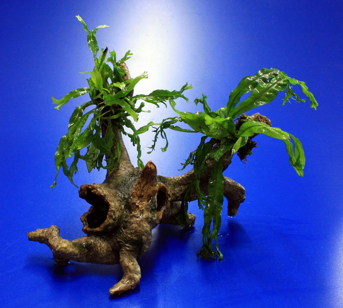 Der Stamm der Deko-Wurzel mit Höhle hat eine schöne Verästelung und Javafarn / Microsorum pteropus Windelov bildet die Blattkrone. Urwaldbäume werden in speziellen Klimazelten kultiviert, so dass sie in jedem Aquarium sofort gut weiterwachsen. Im Aquarium bilden die Urwaldbäume dichte, sattgrüne „Blattkronen“. Für Ihre Fische bieten Urwaldbäume Reviergrenzen, Rückzugsmöglichkeiten und Laichplätze. Die Pflanze kann mit der Deko-Wurzel sehr schnell umgesetzt oder aus dem Aquarium entnommen werden. Also sehr praktisch beim Herausfangen von Tieren aus dem Aquarium – hervorragend geeignet für Zuchtbecken. Die Deko-Wurzel besteht aus unverrottbarem Kunststoff mit zahlreichen feinen Details. Die Kunststoffwurzel hat keine scharfen Ecken und Kanten – die Verletzungsgefahr für Welse und andere Raspler ist somit absolut minimiert. Im Gegensatz zu Naturwurzeln gibt die Kunststoffwurzel keine Tannine ab, somit wird das Wasser nicht verfärbt.